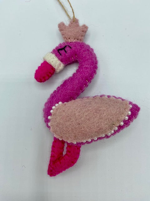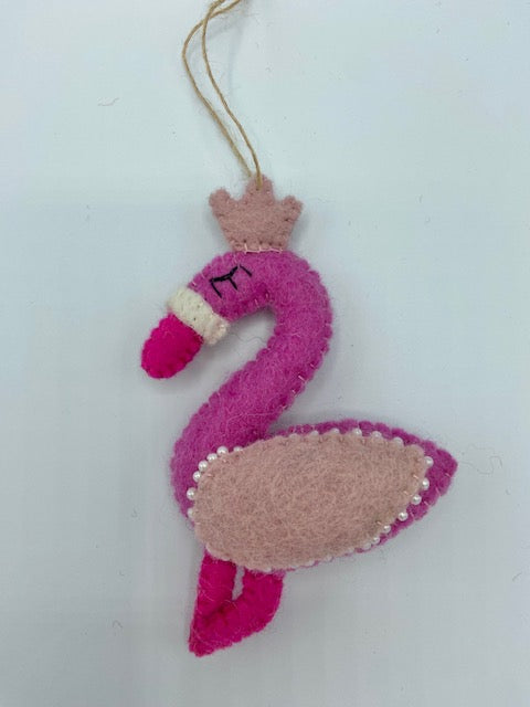 Call her The Queen! This sweet hand felted pink flamingo comes with a crown and delicate pearl details. Charming and bright she will add a pop of colour to your tree, car or bedroom.