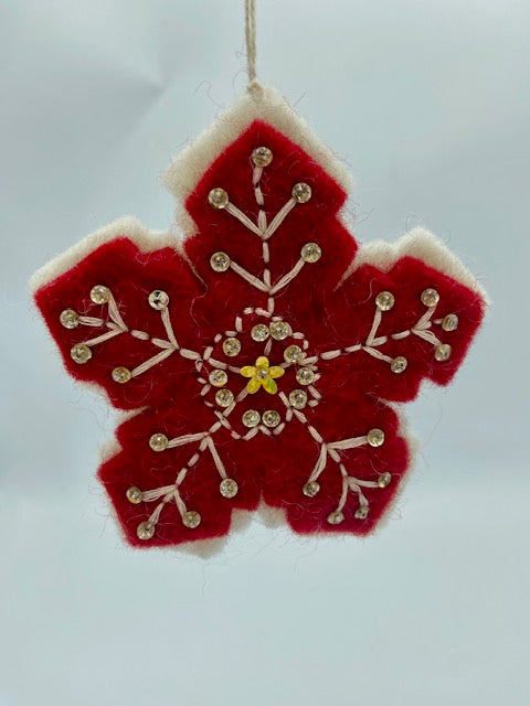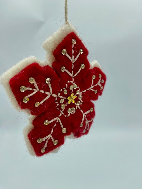This bright and festive hand embroidered red felt snowflake will add a splash of colour and elegance to any location.